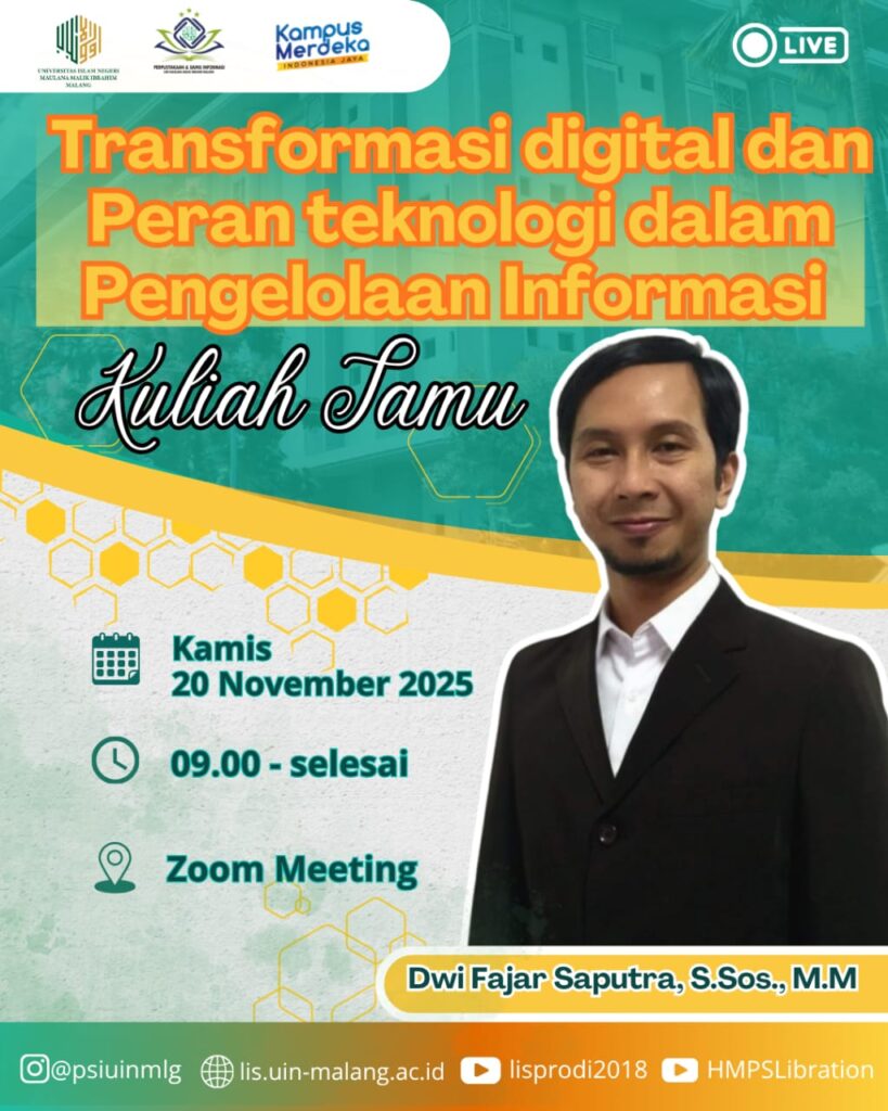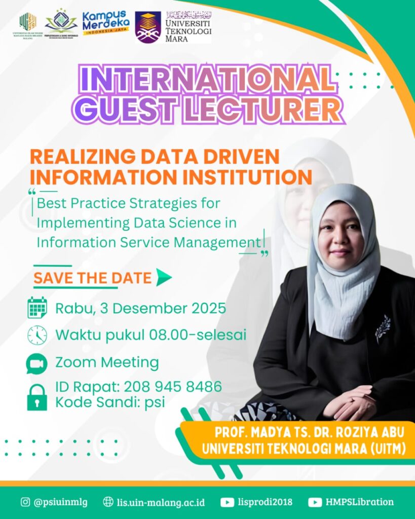 LIS UIN Maliki Malang — (03/12/2025) Program Studi Perpustakaan dan Sains Informasi (PSI) UIN Maulana Malik Ibrahim Malang menyelenggarakan kuliah tamu internasional bertajuk “Realizing Data Driven Information Institution Best Practice...